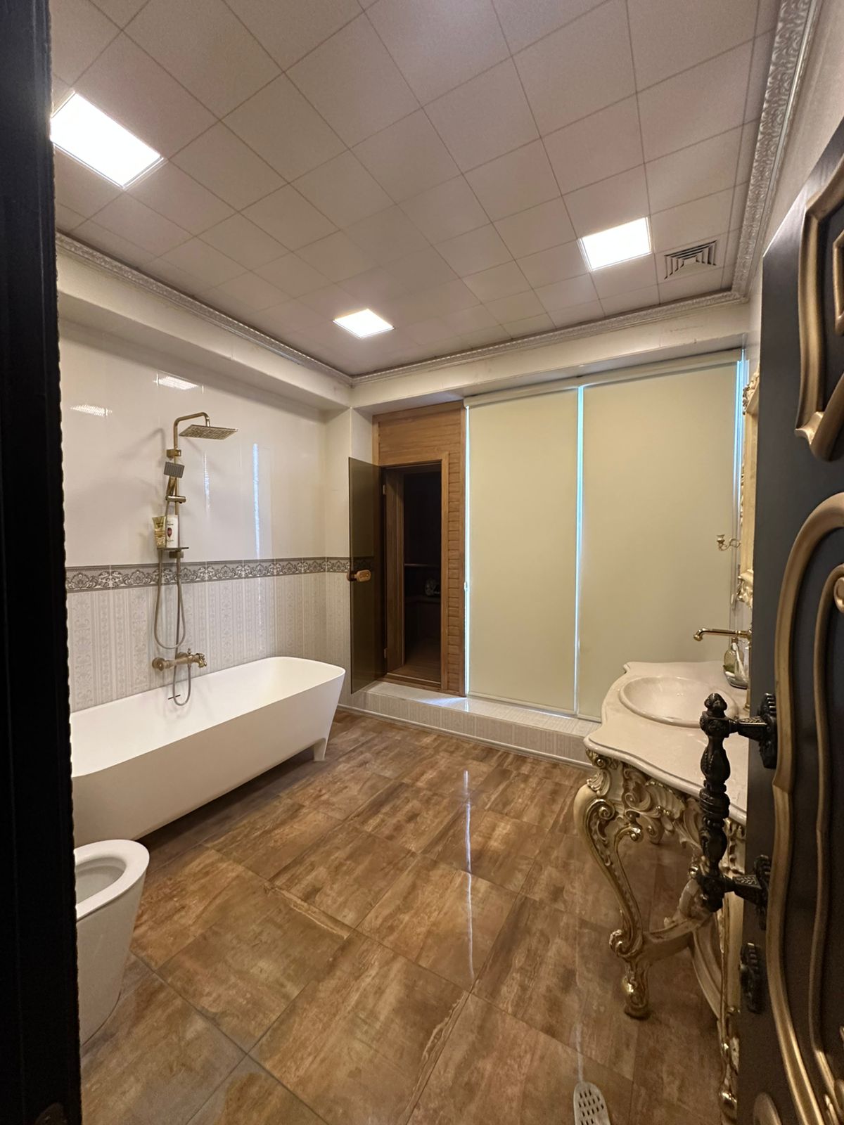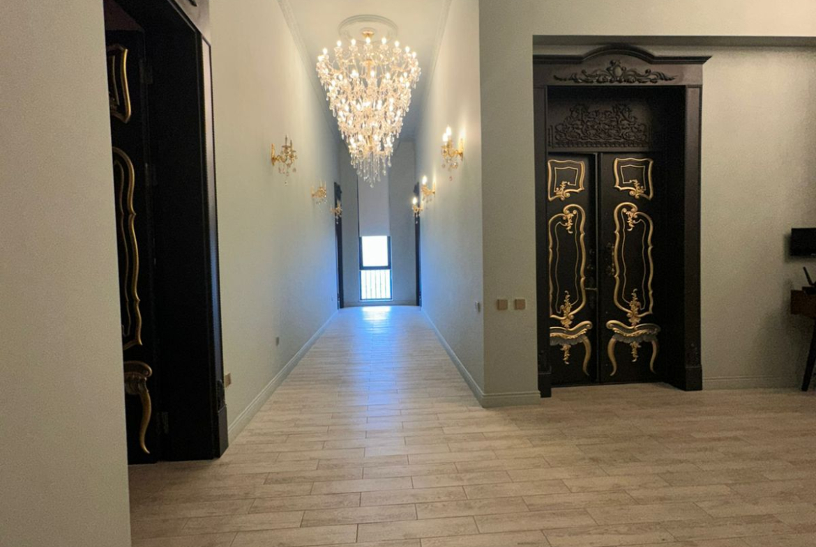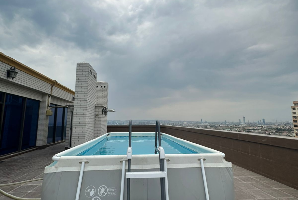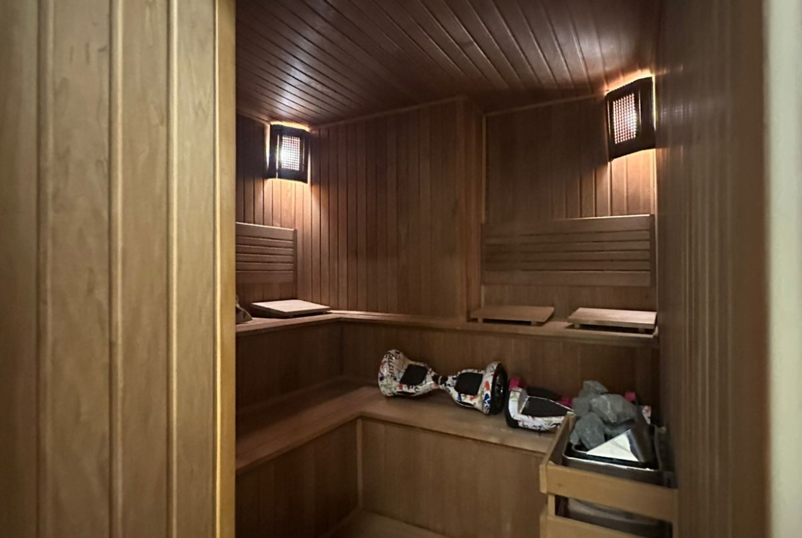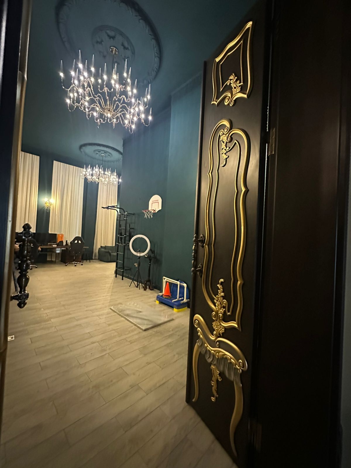 The apartment is a penthouse. The interior size is 565 square meters. The balconies are 400–400–800 square meters. Inside the apartment, there are 5 bathrooms, 1 sauna, 2 living rooms, and 3 bedrooms. Each bedroom has its own wardrobe, bathroom, large study room, and a spacious living area. Additionally, there are 4 extra wardrobes.