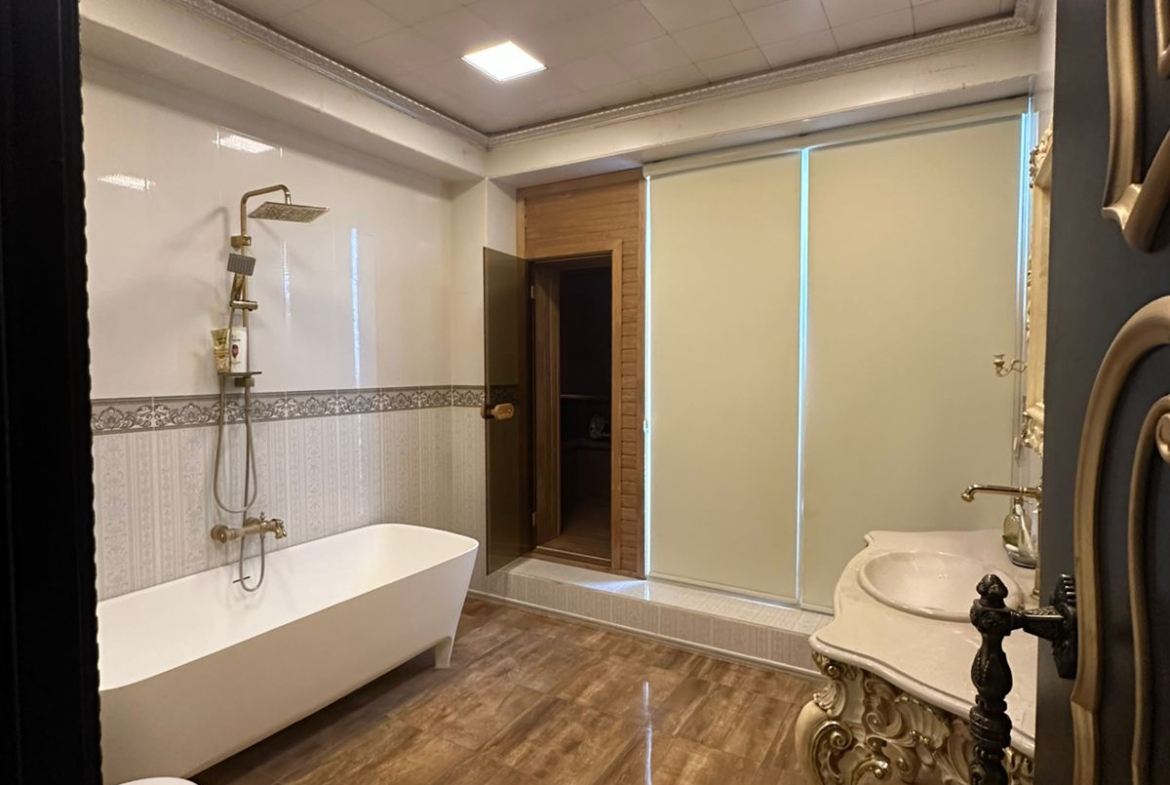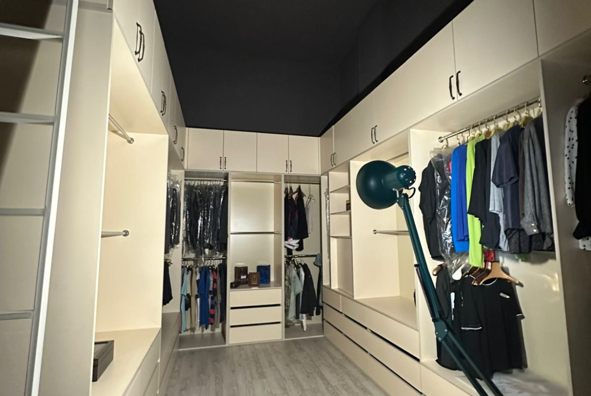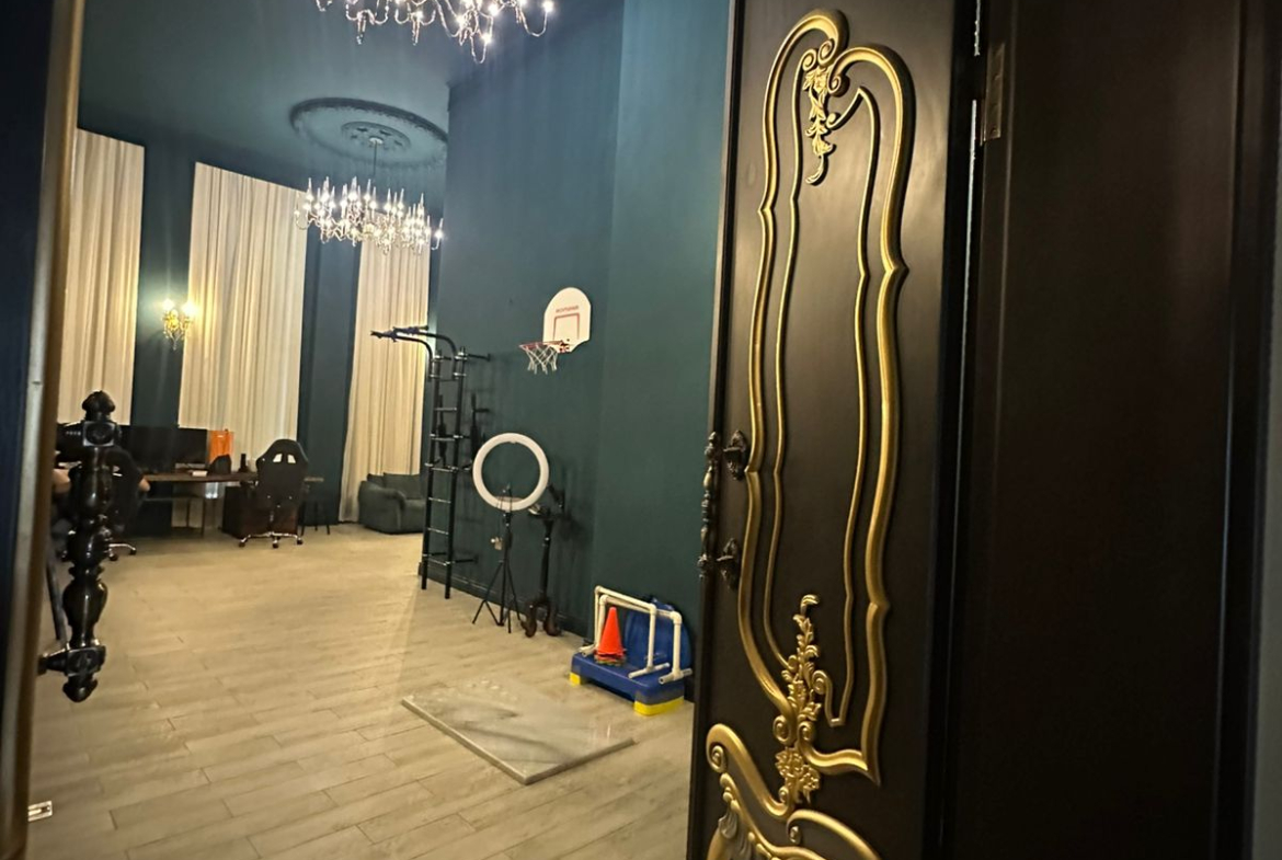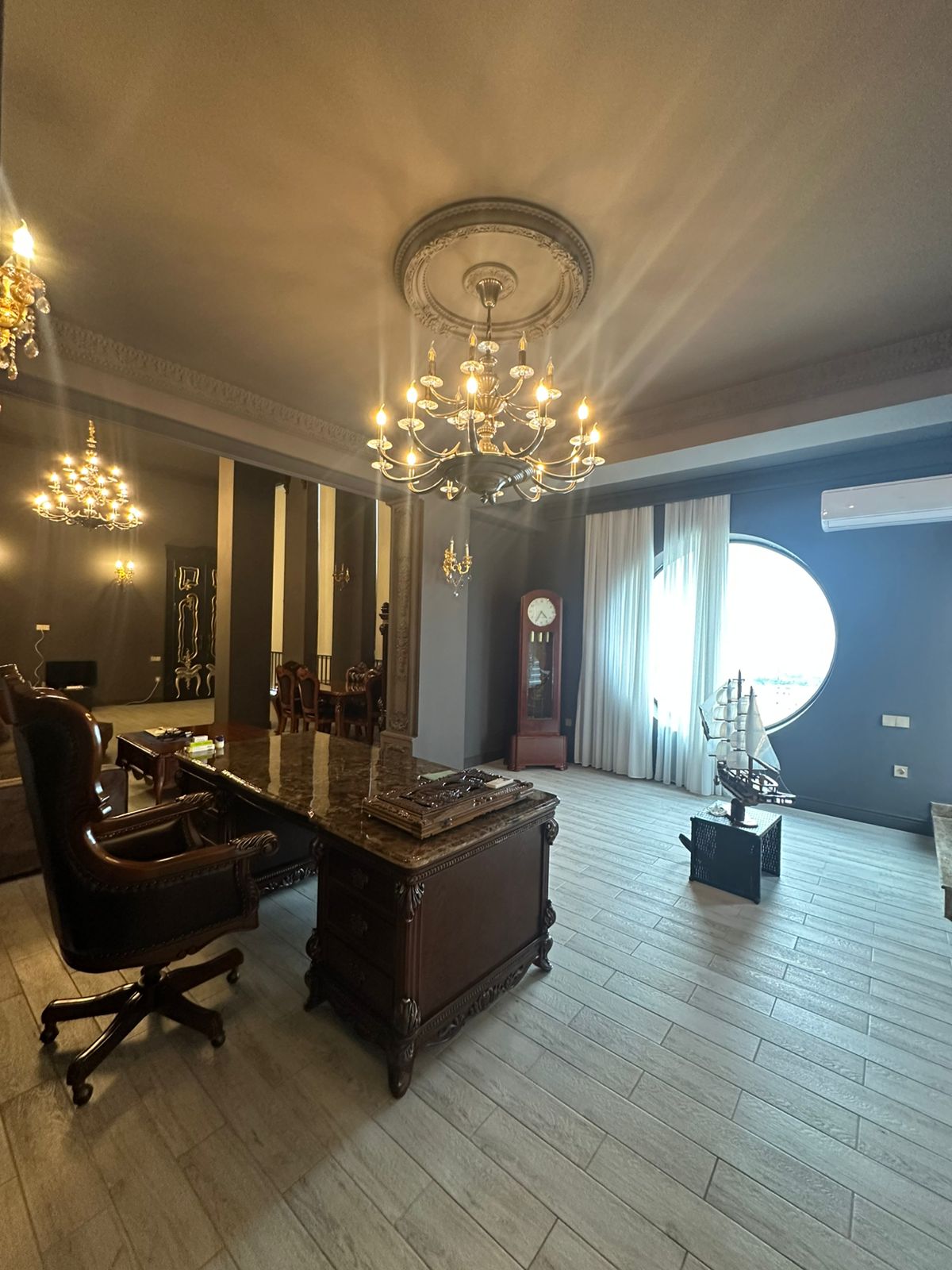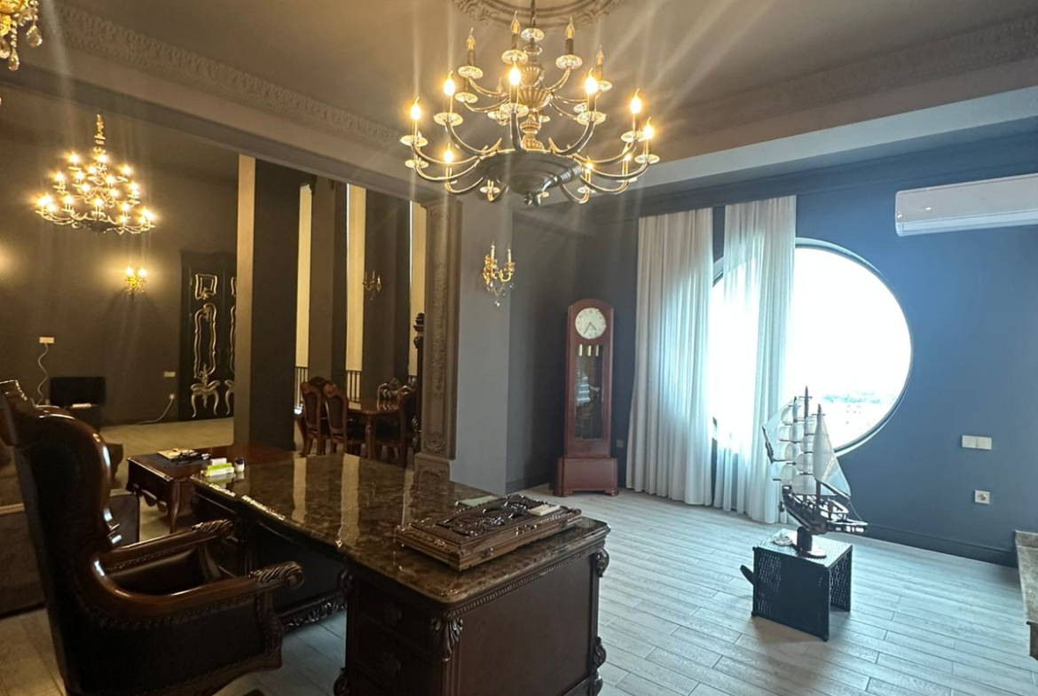 The apartment is a penthouse. The interior size is 565 square meters. The balconies are 400–400–800 square meters. Inside the apartment, there are 5 bathrooms, 1 sauna, 2 living rooms, and 3 bedrooms. Each bedroom has its own wardrobe, bathroom, large study room, and a spacious living area. Additionally, there are 4 extra wardrobes.