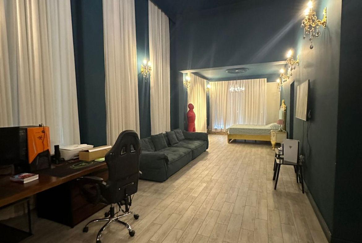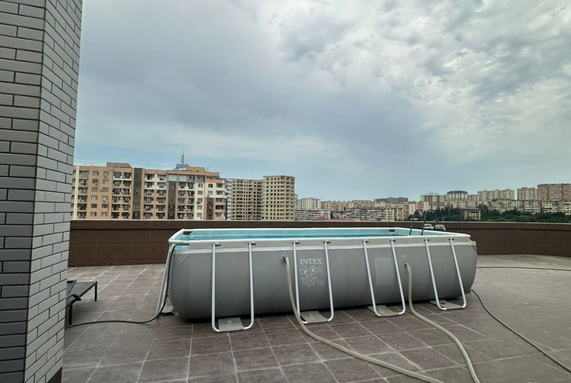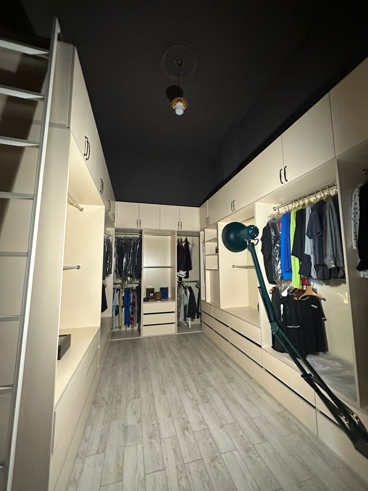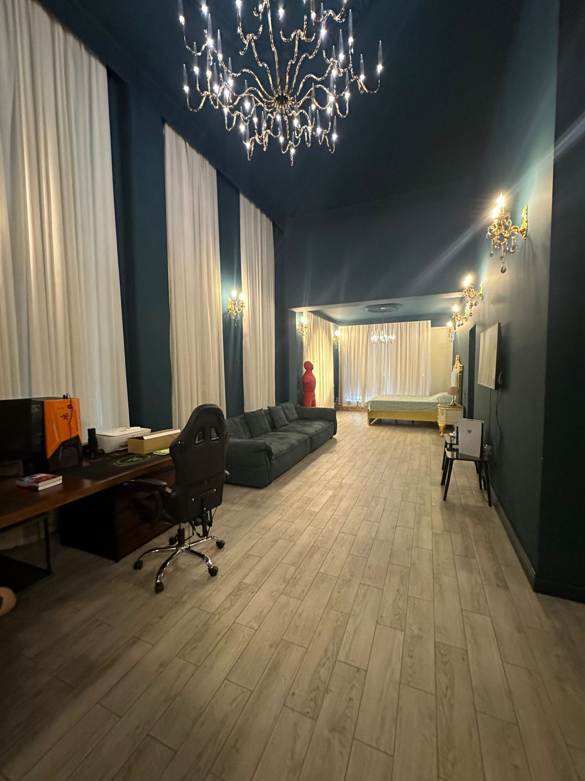 The apartment is a penthouse. The interior size is 565 square meters. The balconies are 400–400–800 square meters. Inside the apartment, there are 5 bathrooms, 1 sauna, 2 living rooms, and 3 bedrooms. Each bedroom has its own wardrobe, bathroom, large study room, and a spacious living area. Additionally, there are 4 extra wardrobes.