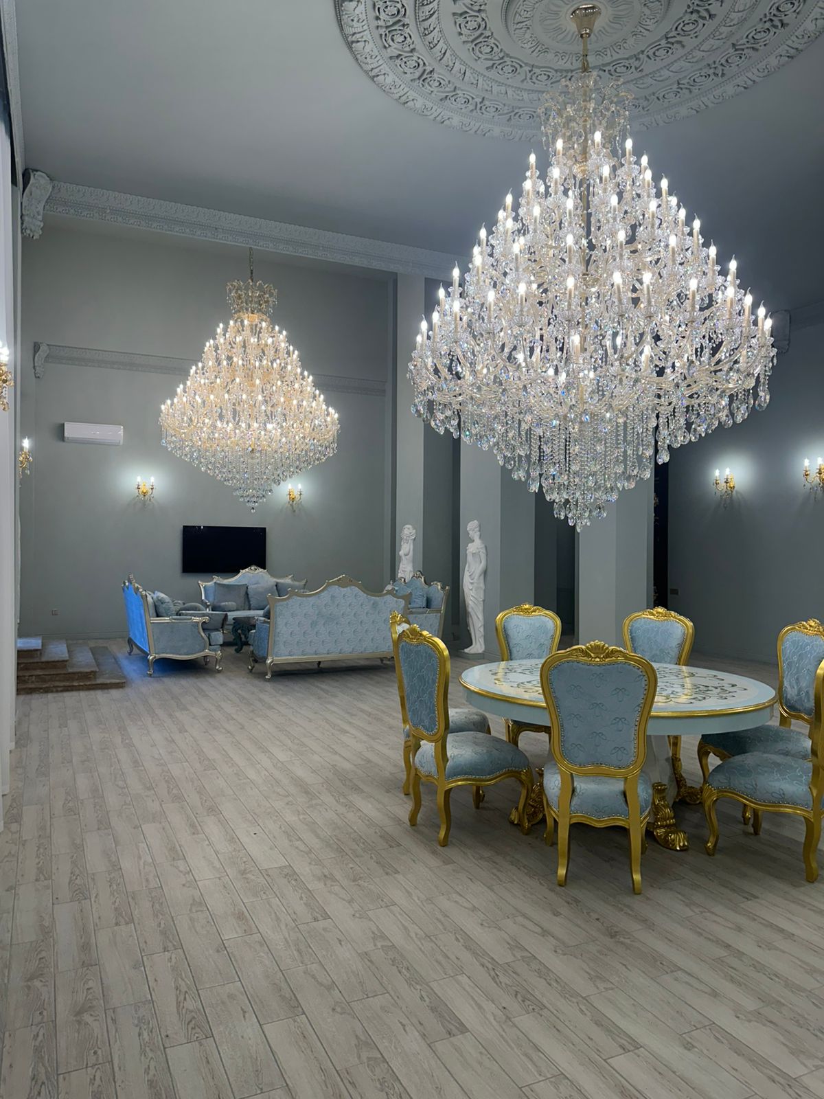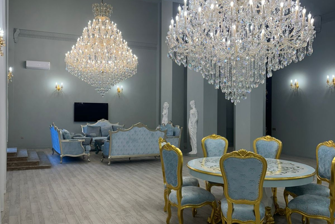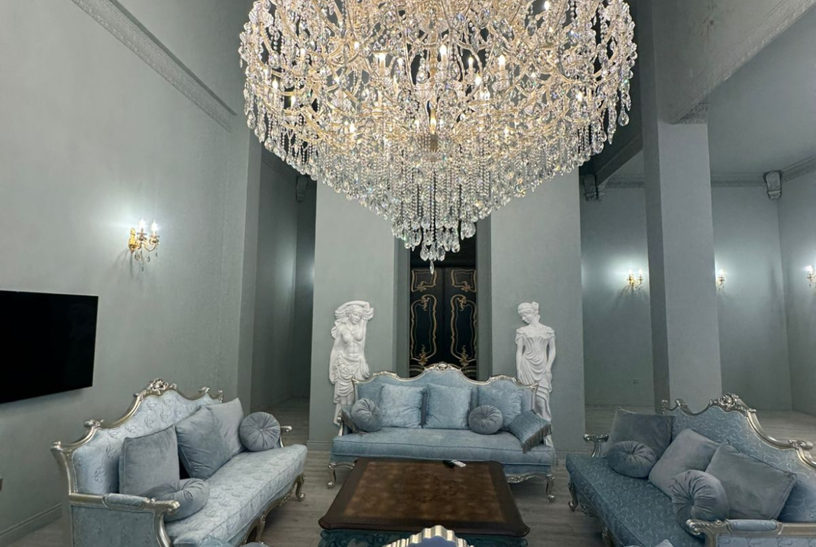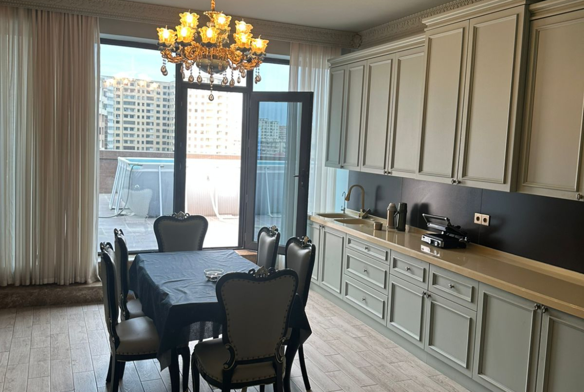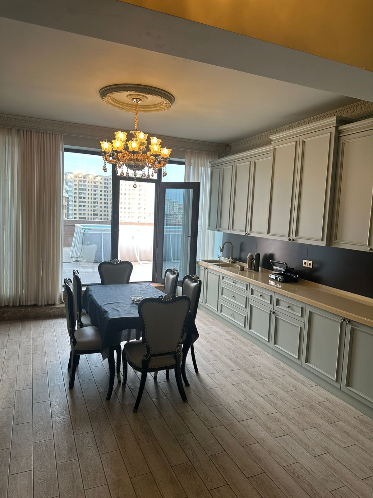 The apartment is a penthouse. The interior size is 565 square meters. The balconies are 400–400–800 square meters. Inside the apartment, there are 5 bathrooms, 1 sauna, 2 living rooms, and 3 bedrooms. Each bedroom has its own wardrobe, bathroom, large study room, and a spacious living area. Additionally, there are 4 extra wardrobes.